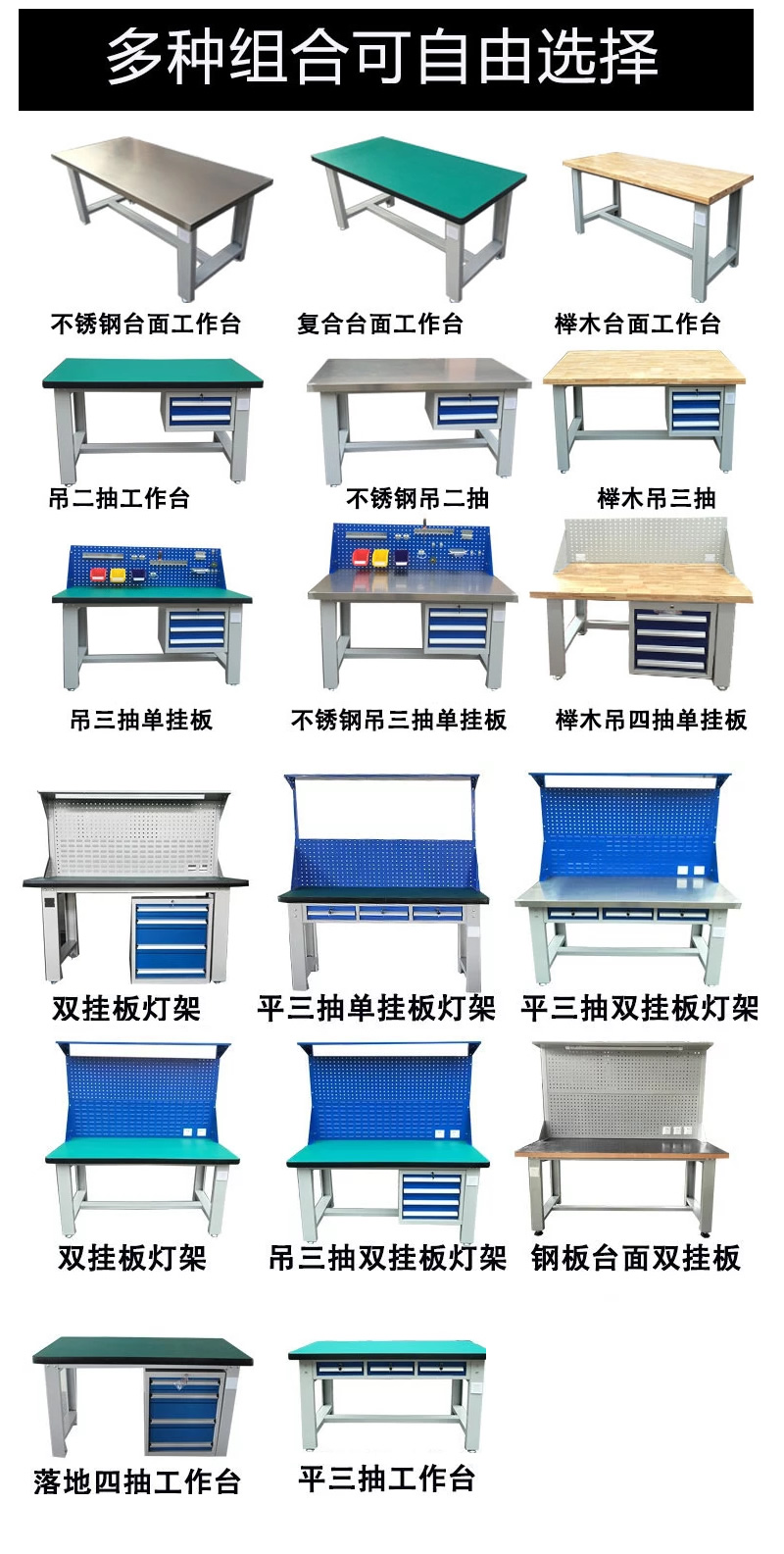 工作台采用优质冷扎板精工制作而成,坚固的工作桌框架,牢固平稳,可使工作桌承重1000kg;多种工作桌面选择,可配合不同使用的要求;工具吊柜(箱),侧柜(箱)灯架,调节脚杯,,外形美观;层板,抽屉质量上乘,承重大,抽屉内可根据需要任意分隔;节约空间,适用性强。