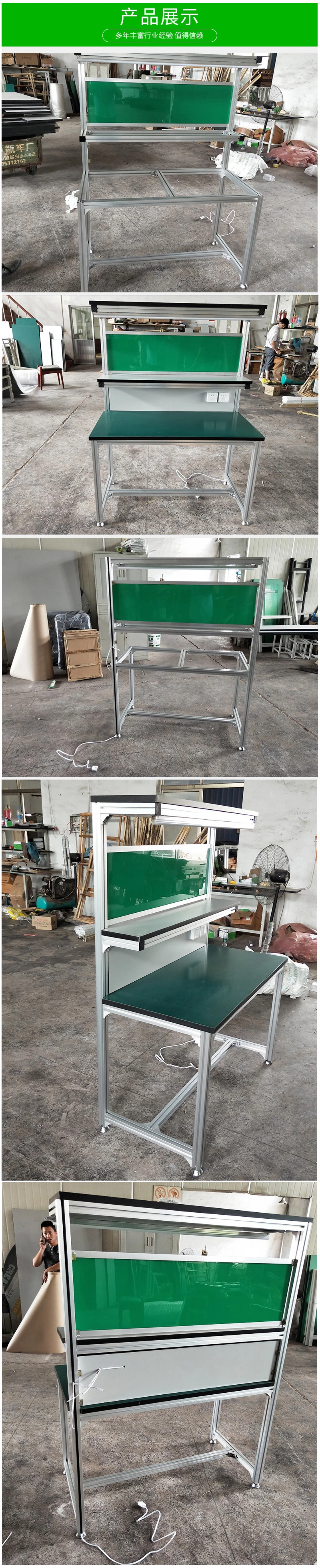 工作台适合于模具、钳工、检测、维修、组装等各种不同应用场合,具有良好的耐腐蚀性,耐脏性,抗冲击性和承重能力强。桌面经特殊处理,具有防腐、抗冲击力强等特点,多种桌面的选择,可配合不同的使用要求;所配置的抽屉、柜门方便使用者存储工具;桌角上预留电源孔,方便安装电源插座。工作台(桌)分为轻型(可承重300公斤),中型和重型工作台(桌)可承重1000公斤及特制的工作台。可根据需要灵活地配置各种吊柜、单柜、双柜等,可加装挂板,电器板,灯顶板、调节脚杯,轮子,搁板等桌上部件,具有多种选择,能够满足各种工位的需求。