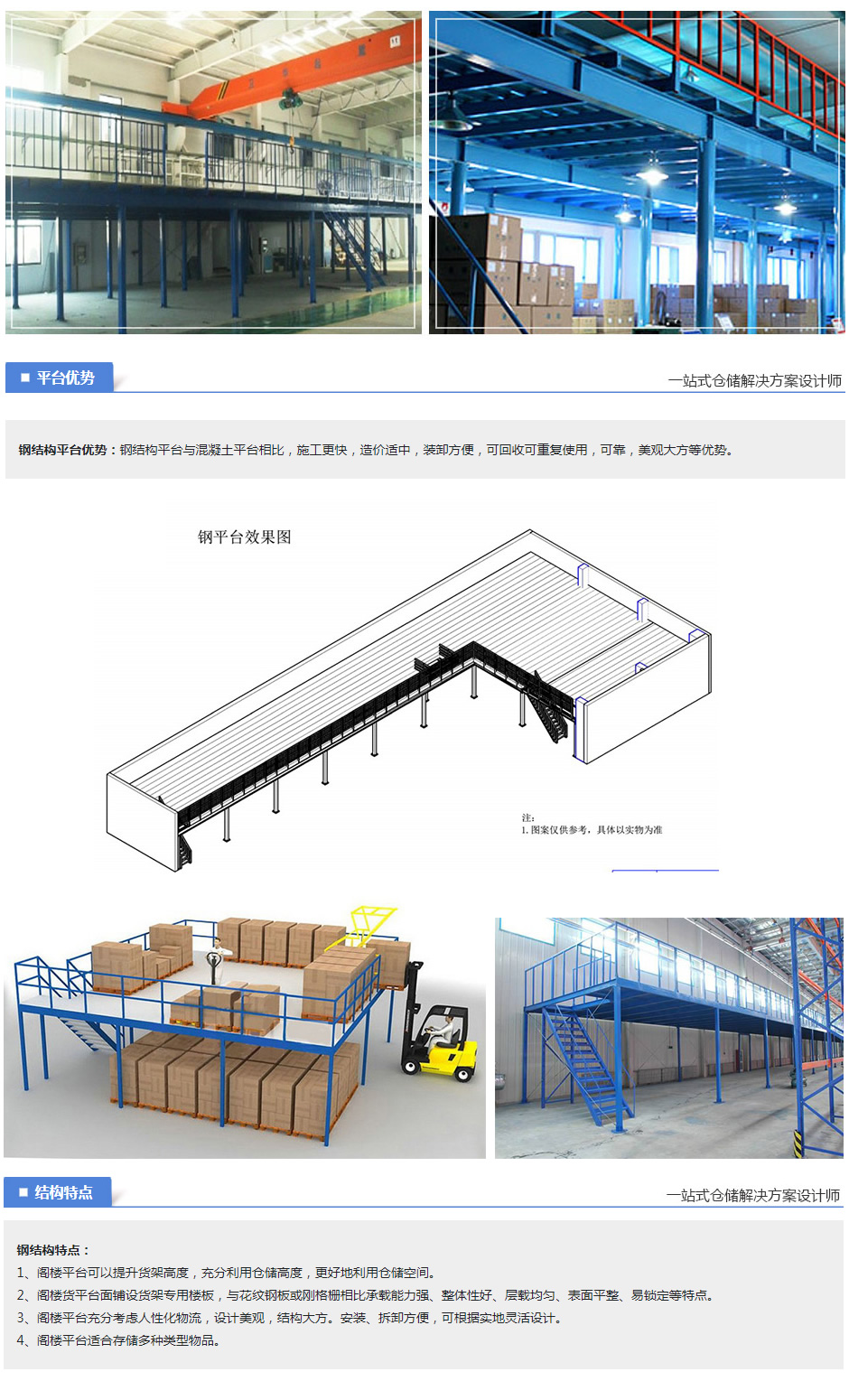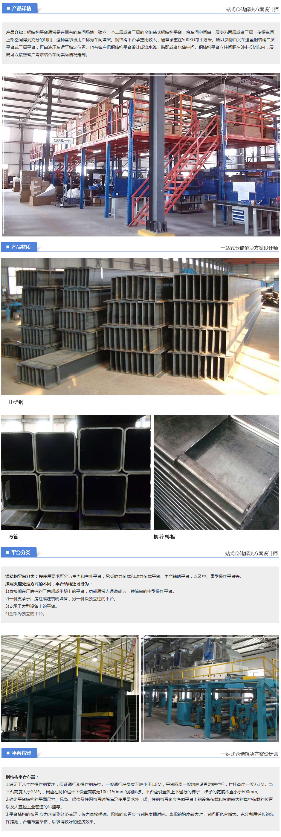 钢结构平台亦称工作平台。现代钢结构平台结构形式多样,功能也一应俱全。 其结构特点是全组装式结构,设计灵活,在现代的存储中较为广泛应用。